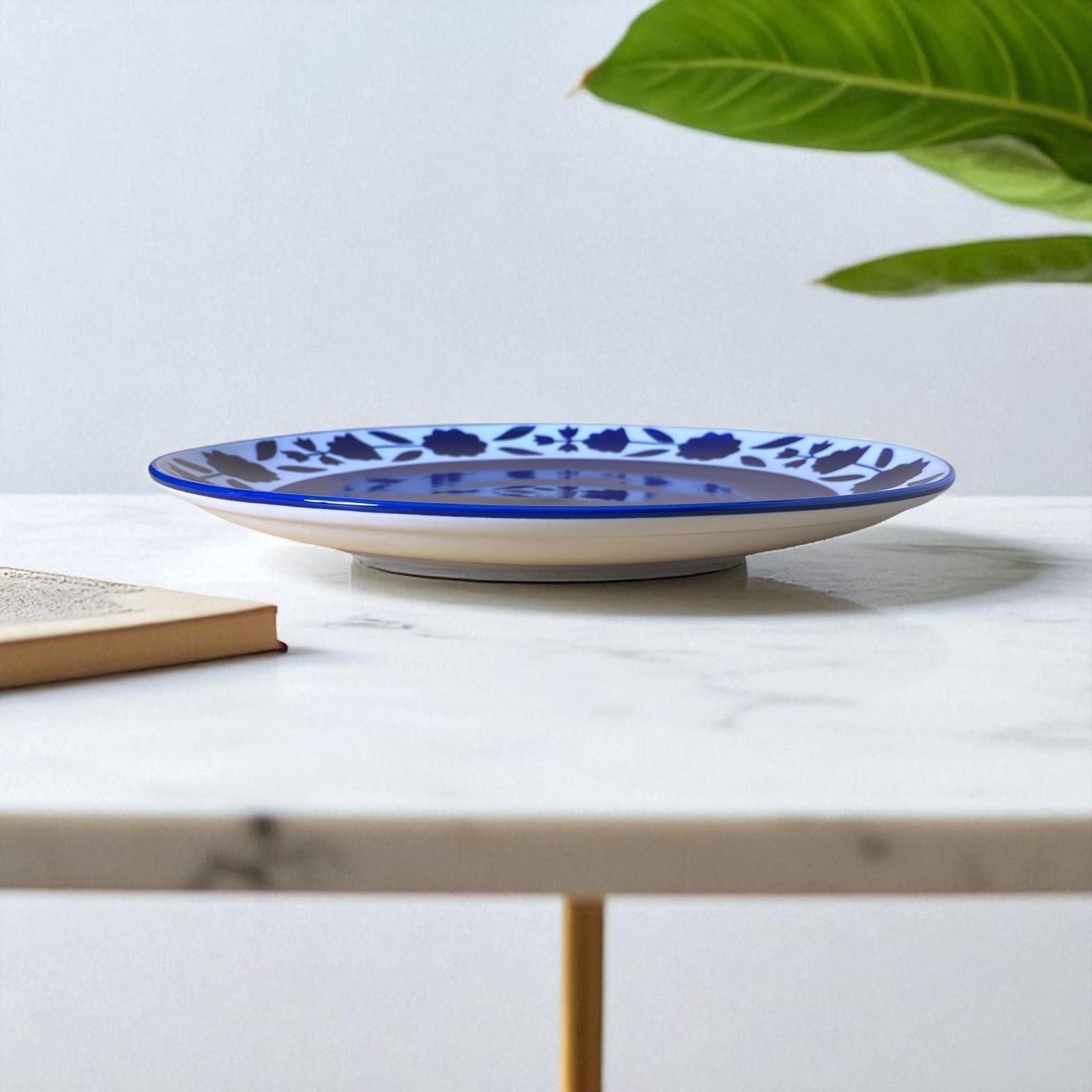 An elegant indigo dinner plate featuring a bold floral border and circular pattern. Perfect for festive thalis, dinner parties, or gifting as premium serveware.